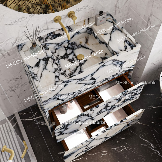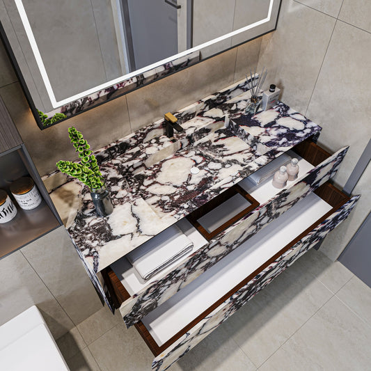 Wall Mount Calacatta Viola Marble Vanity Unit with Marble Drawers and Integrated Sink