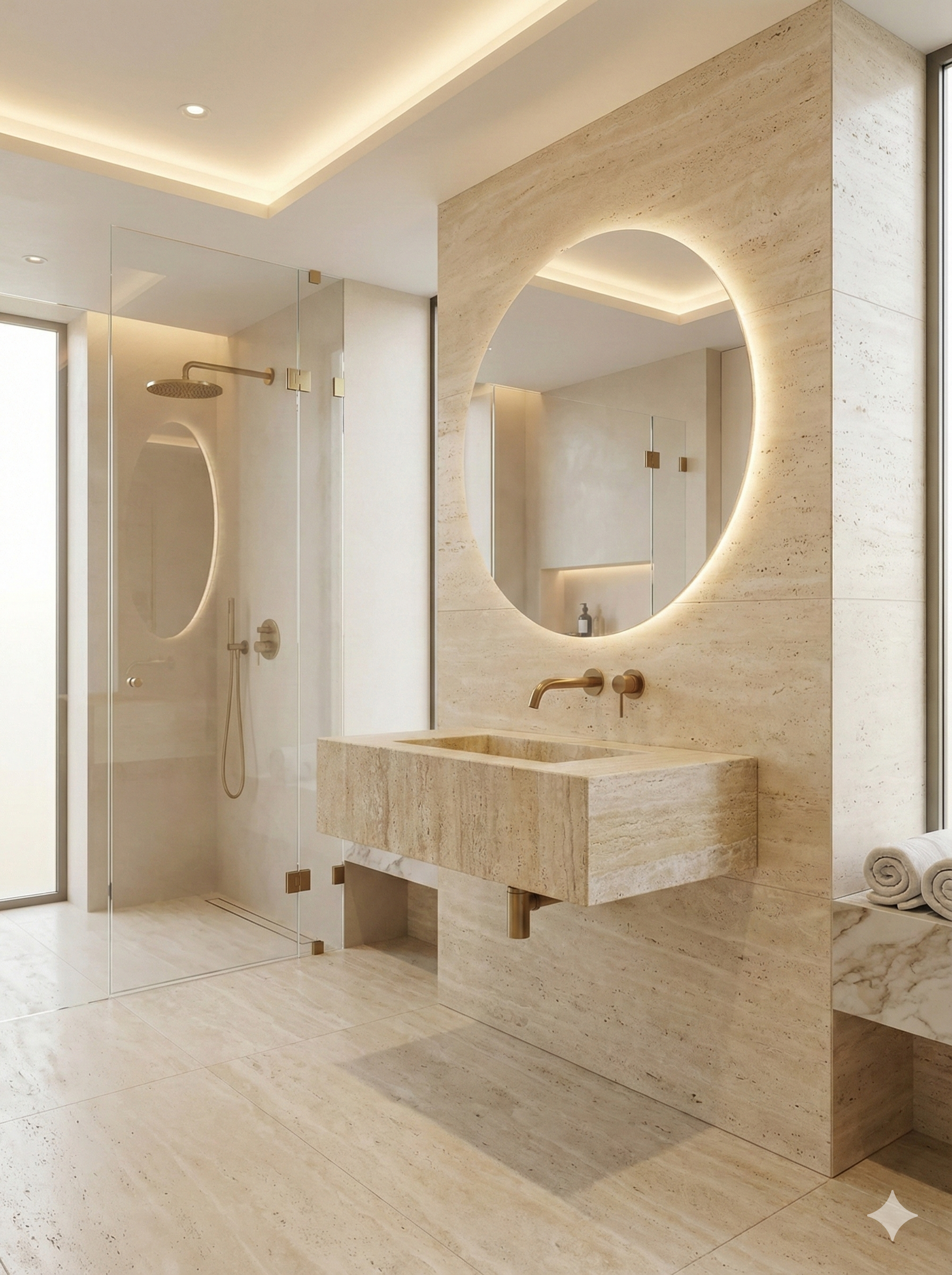 Timeless Material: Travertine offers a warm, neutral palette that pairs perfectly with brass, gold (as seen in photos), or matte black fixtures.